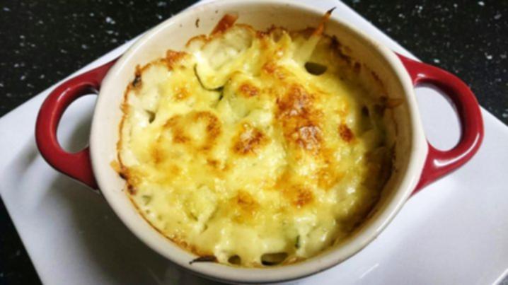 Put a layer of potato about 1 cm thick in the bottom of each ramekin. Add a thin layer of zucchini, then a sprinkle of onion, then a layer of cheese.